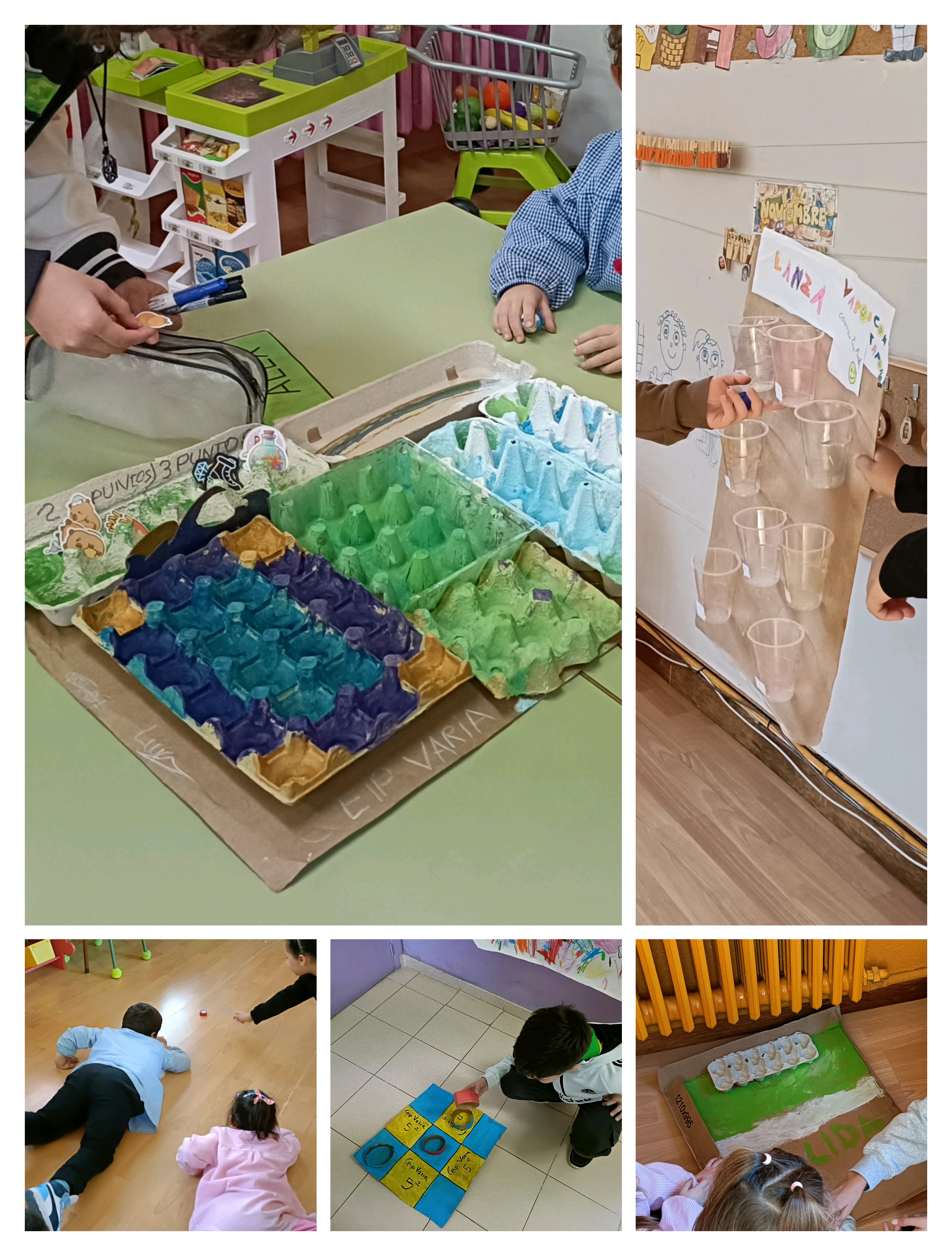 Los alumnos y alumnas de 5º han creado diferentes juegos de mesa con material reciclado para jugar con sus compañeros y compañeras de infantil.